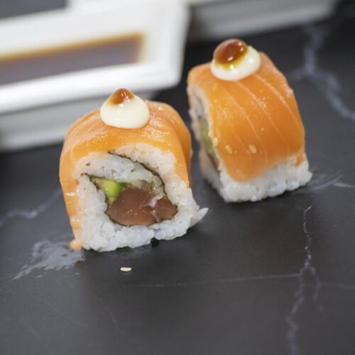 Salmon lovers rejoice! The Double Salmon Roll brings together both fresh salmon and seared salmon, creating a mouthwatering harmony of textures. The melt-in-your-mouth freshness of raw salmon blends beautifully with the smoky richness of the seared layer, making this roll a standout choice for anyone who can’t get enough of this classic fish.